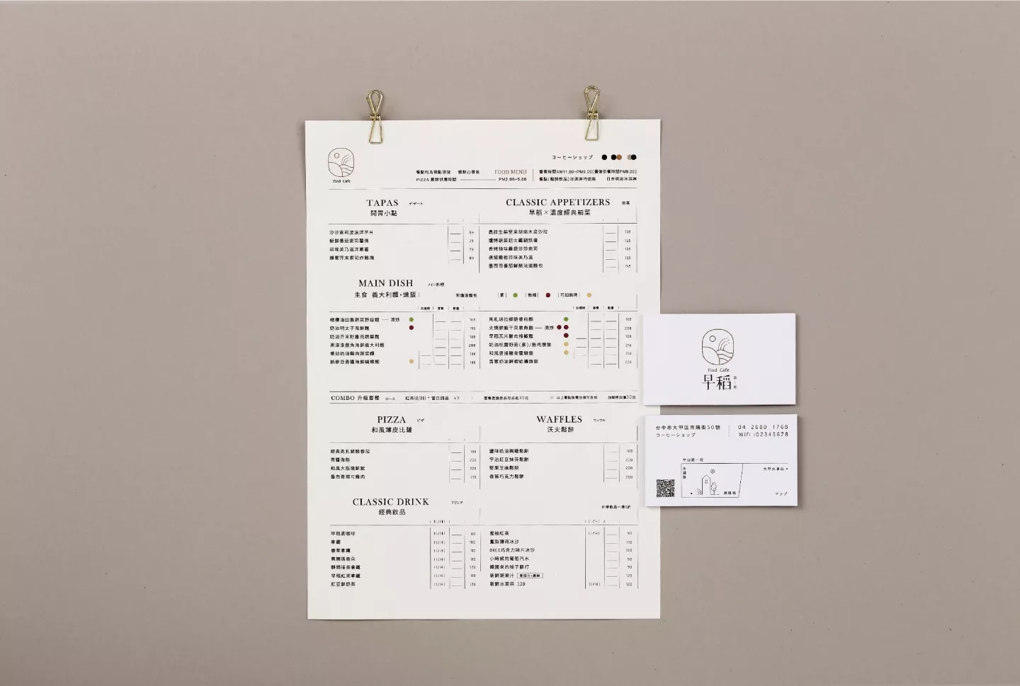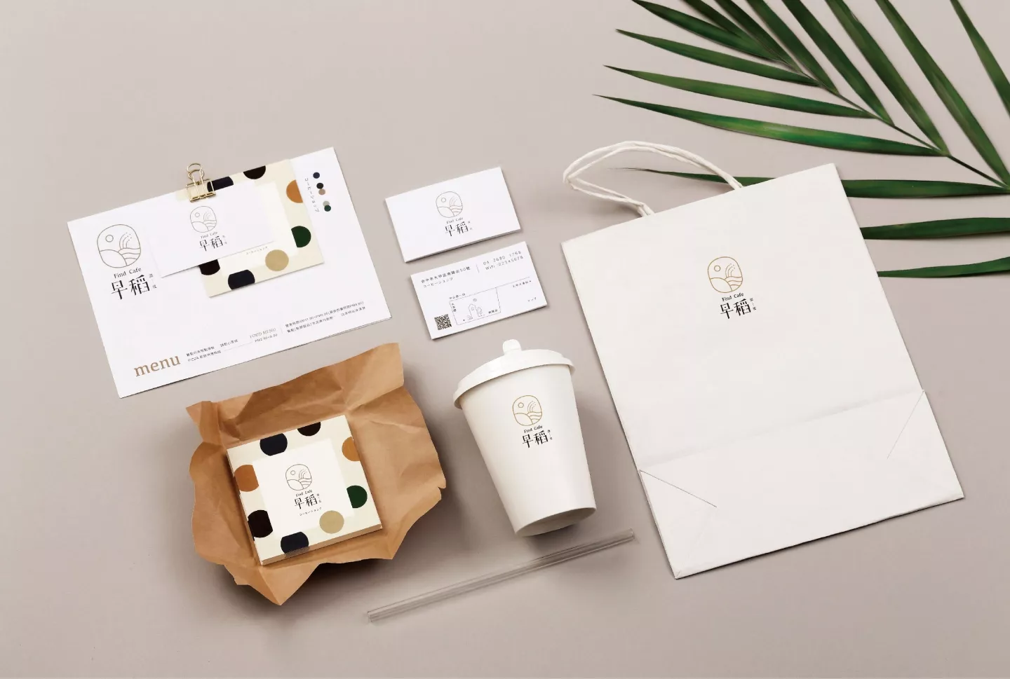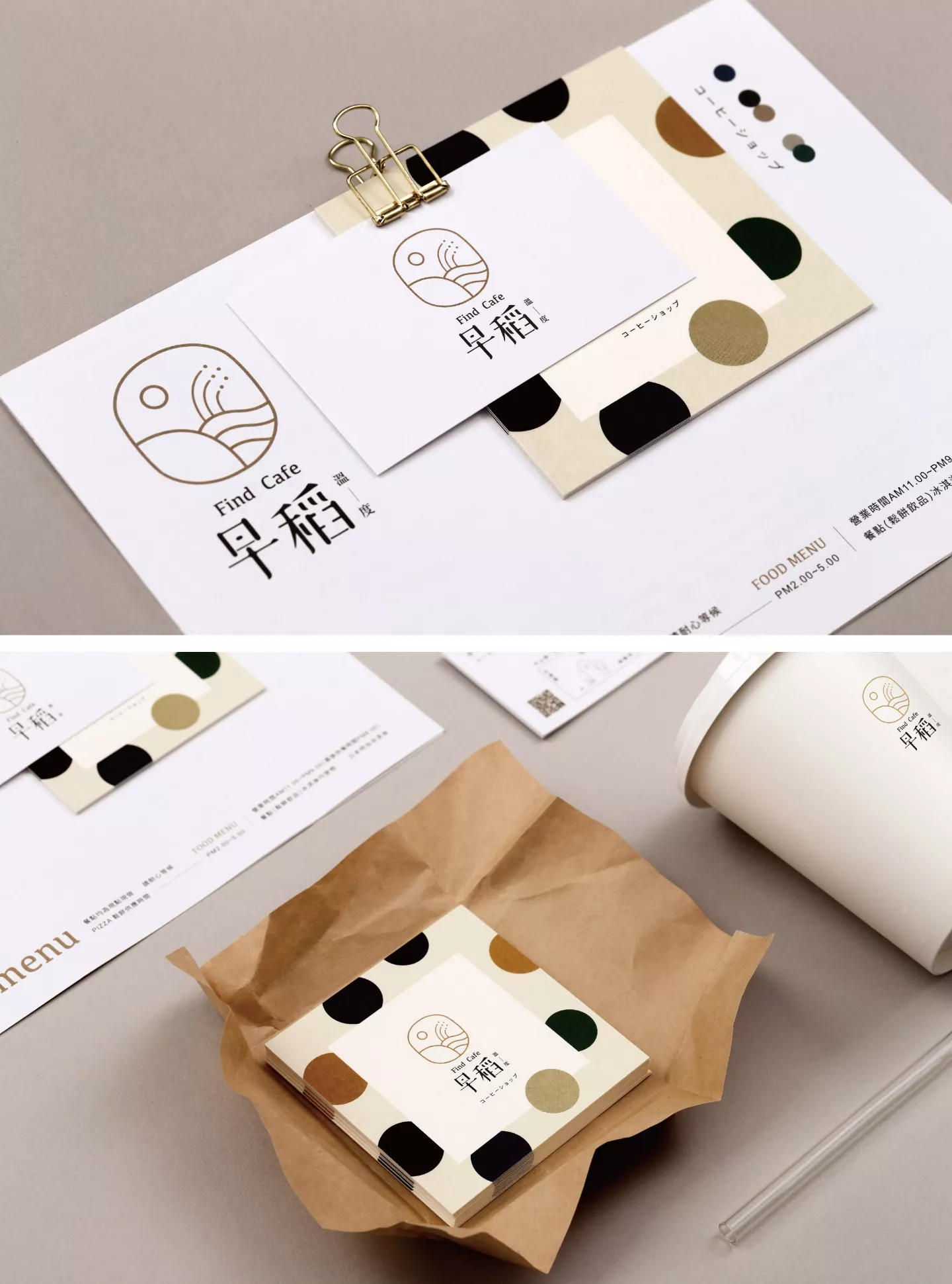 字體設定為偏明朝字體的人文簡樸,定義日式職人般對手作料理的專業精神和穩紮實在。LOGO以金色為標準色,兼具樸實與經典,融合「日光」、「水」、「沃土」、「稻米」等元素,象徵充滿朝氣的日子、美好時光,更帶出了「早稻」一頓好食飲,餐食裡選自豐沃大地孕育的新鮮食材烹飪,稻米的意象呼應品牌名,也隱喻著稻穗越飽滿卻越謙卑的精神,留白的空間則傳遞日式究極的純粹和理想精神。