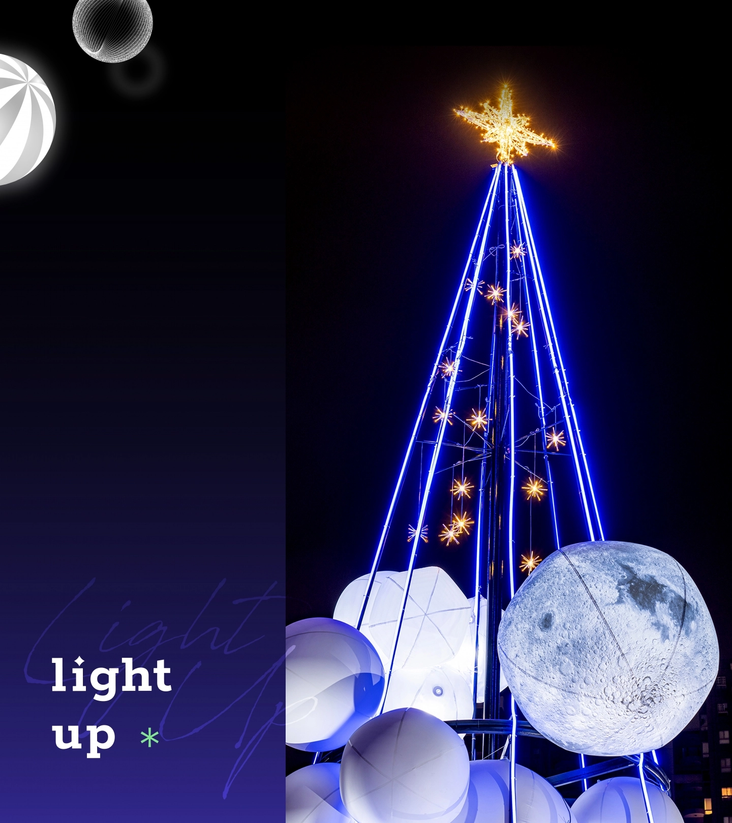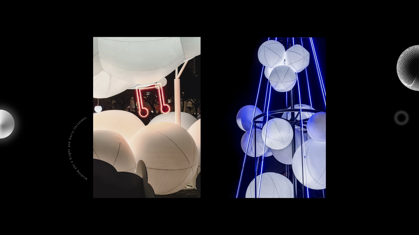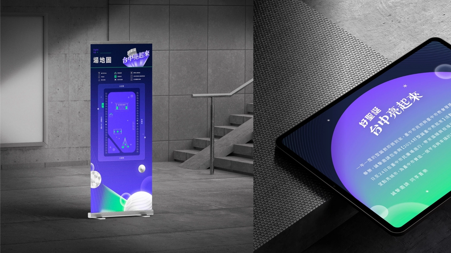 我們將藍紫、螢光綠、星芒白作為主色。藍紫代表夜的深度,螢光綠象徵希望的跳動,而星芒白則成為視覺最純淨的亮點。三種顏色交織出屬於台中的城市節奏——內斂但帶能量,寧靜卻有方向。來自現場裝置的白色球體被抽象化為漂浮的雲、星球與光點,在畫面中以不同尺度散佈。它們構成一種輕柔的立體感,像願望在夜空裡慢慢成形,也像生活裡那些被光照到的瞬間:簡單、真實、不需言語。霧化光圈、細緻星芒與線性光條則進一步讓畫面更具呼吸感,讓視覺在靜止中依然保有溫度。