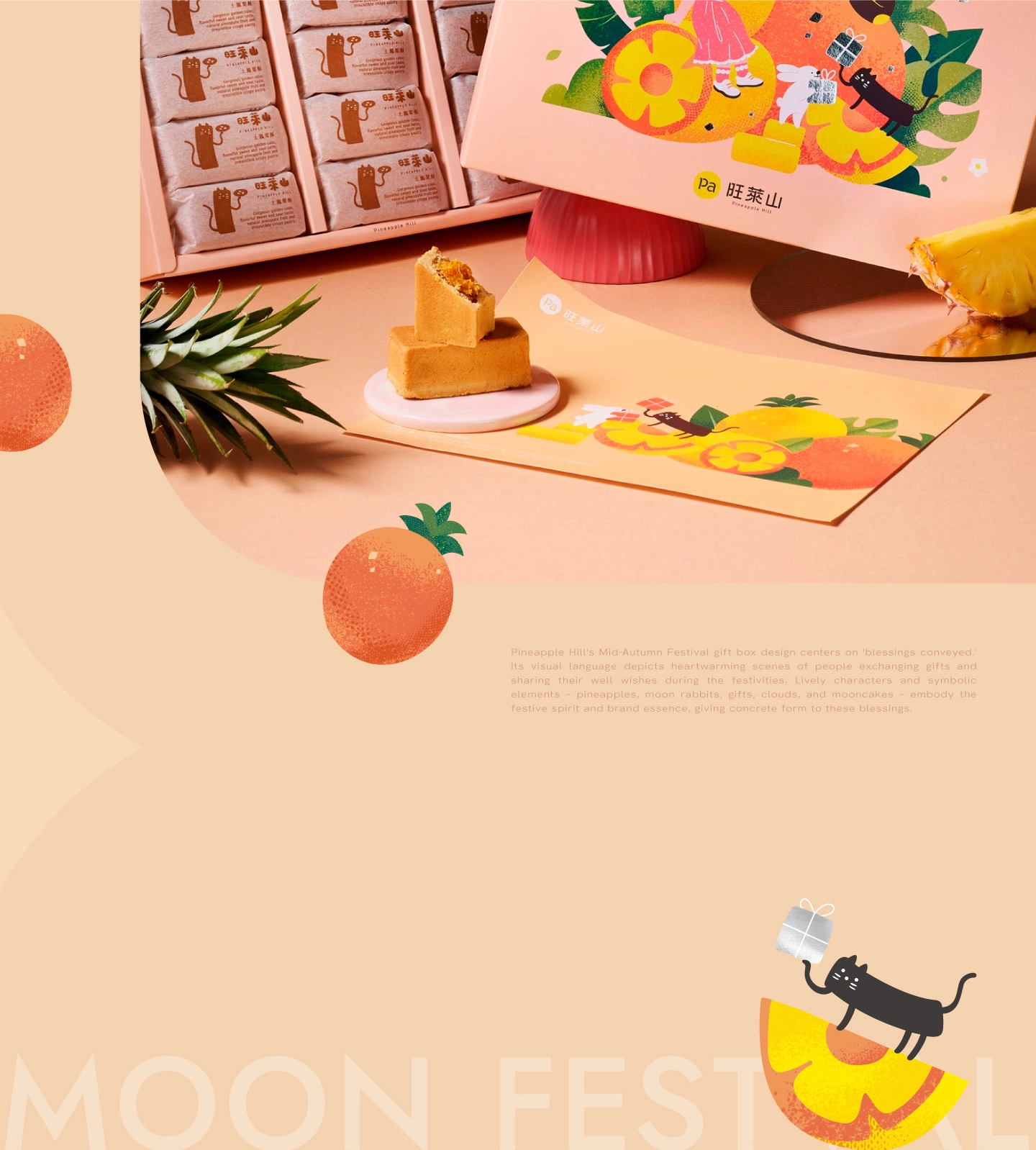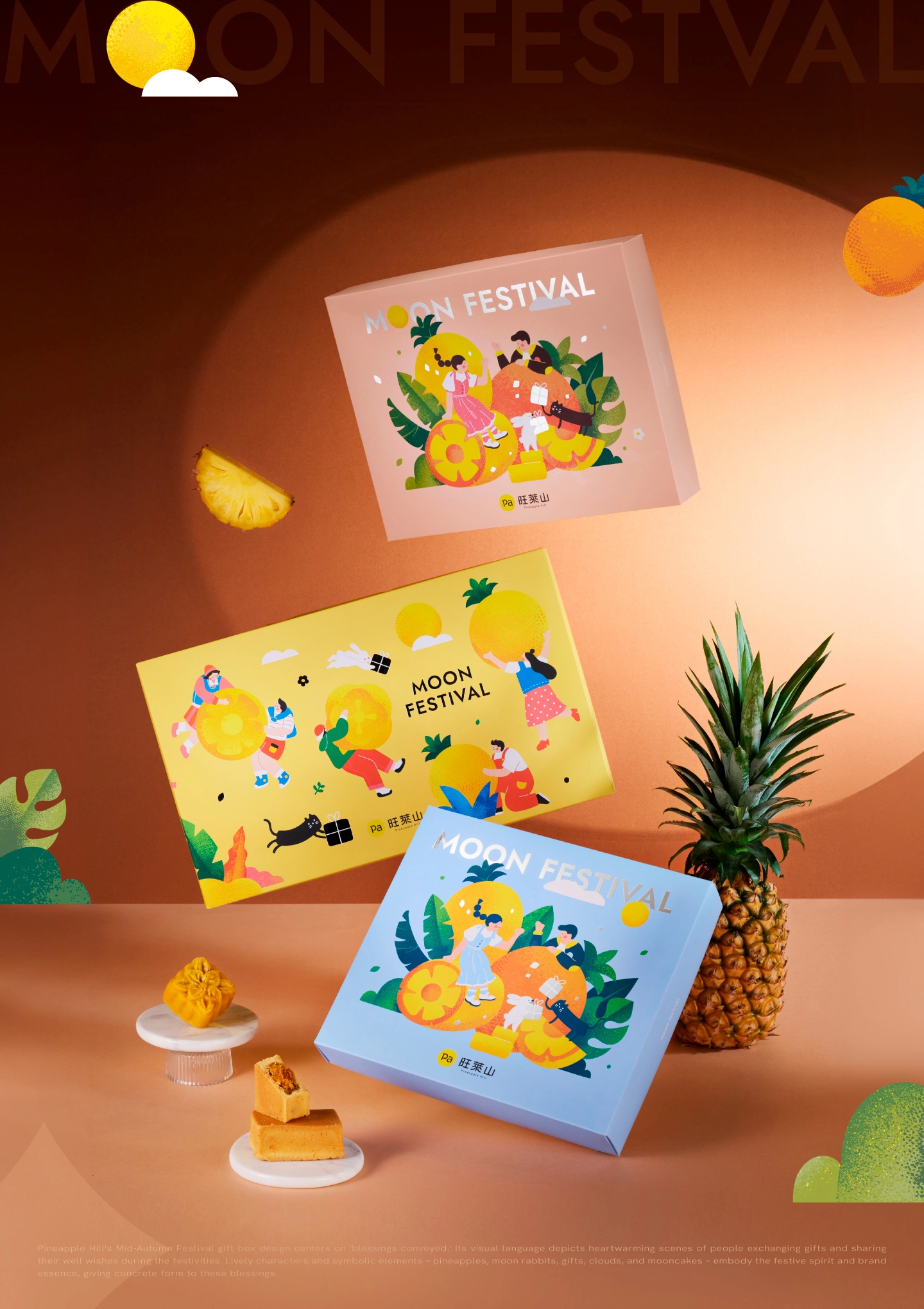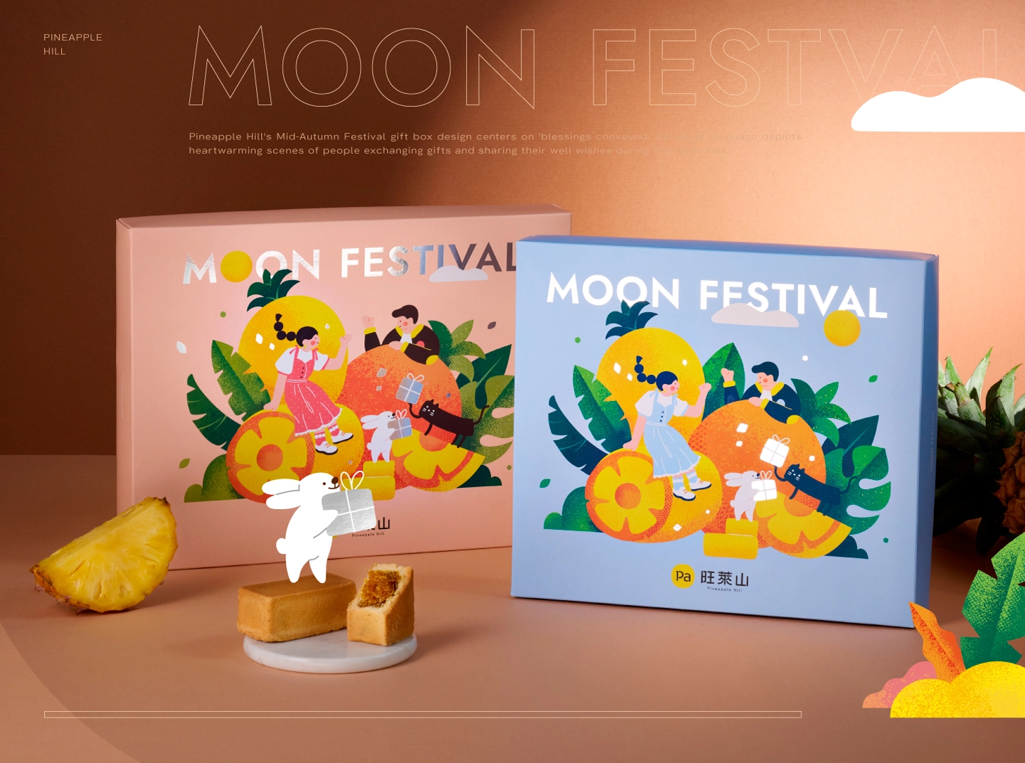 中秋禮盒以「祝福被分享的那一刻」為核心概念,將中秋從單一節慶符號,轉化為一場關於陪伴、交換與情感流動的日常風景。視覺以鳳梨作為主角,結合月亮、雲朵、兔子與禮物等意象,象徵豐收、圓滿與心意的傳遞,讓祝福不再停留在語言,而是被看見、被觸摸、被收藏。