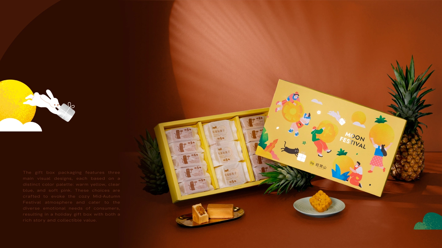 This Mid-Autumn Festival gift box is centered on the idea of “the moment when blessings are shared,” transforming the festival from a single traditional symbol into a warm, everyday scene of companionship, exchange, and emotional connection. Pineapples take the visual lead, combined with imagery such as the moon, clouds, rabbits, and gifts to symbolize harvest, completeness, and the passing of goodwill—allowing blessings to be seen, touched, and treasured rather than merely spoken.