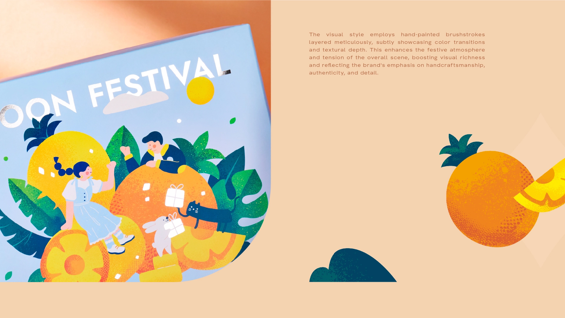 插畫風格採用手繪質感與層層堆疊的色彩筆觸,營造溫暖而真實的節慶氛圍;人物互動的動態構圖,描繪人與人之間交換禮物、分享喜悅的瞬間,使禮盒成為情感交流的載體,而不只是包裝。整體色彩以暖黃、清藍與柔粉為主,對應不同情緒層次,讓中秋不只是一種「傳統」,而是一種被重新感受的生活溫度。我們希望這份設計,能讓收禮的人在打開禮盒的同時,也打開一段被記住的情感時刻。