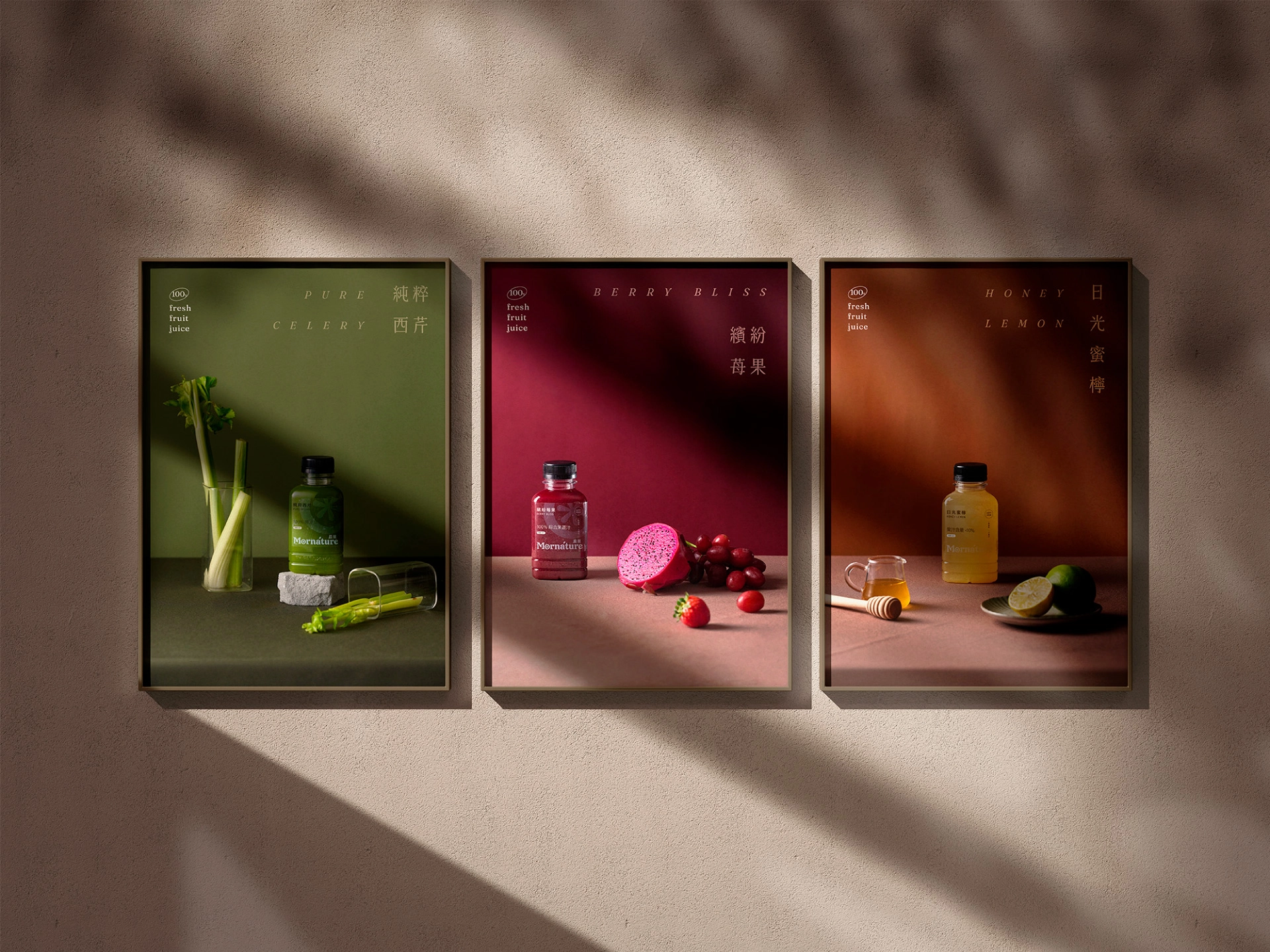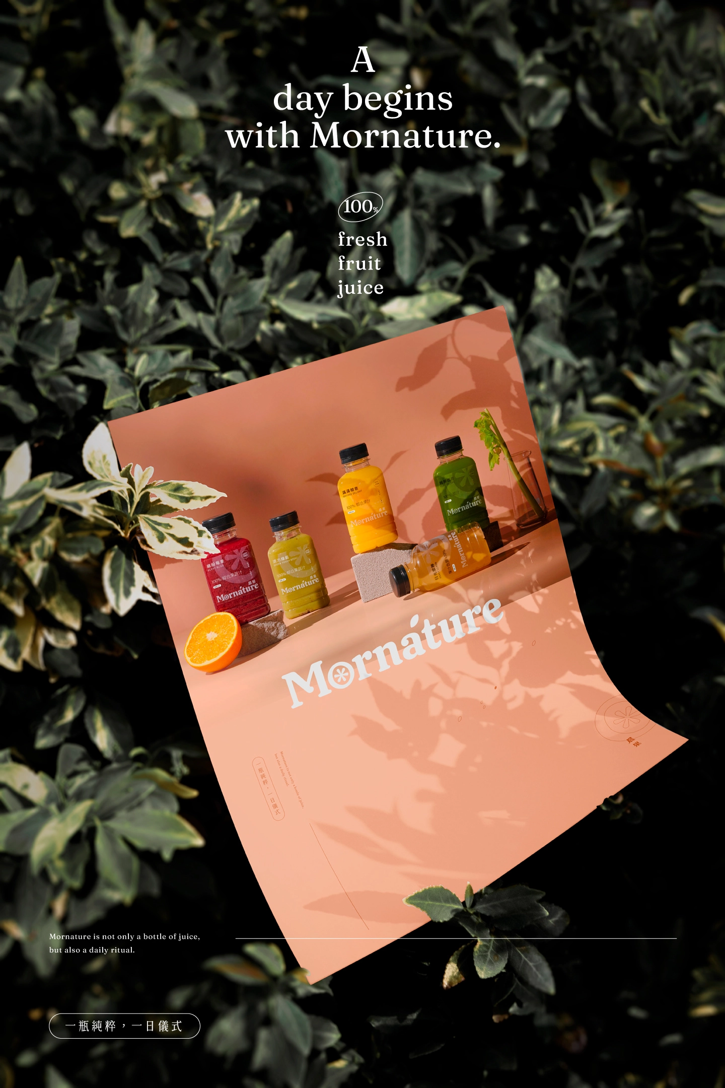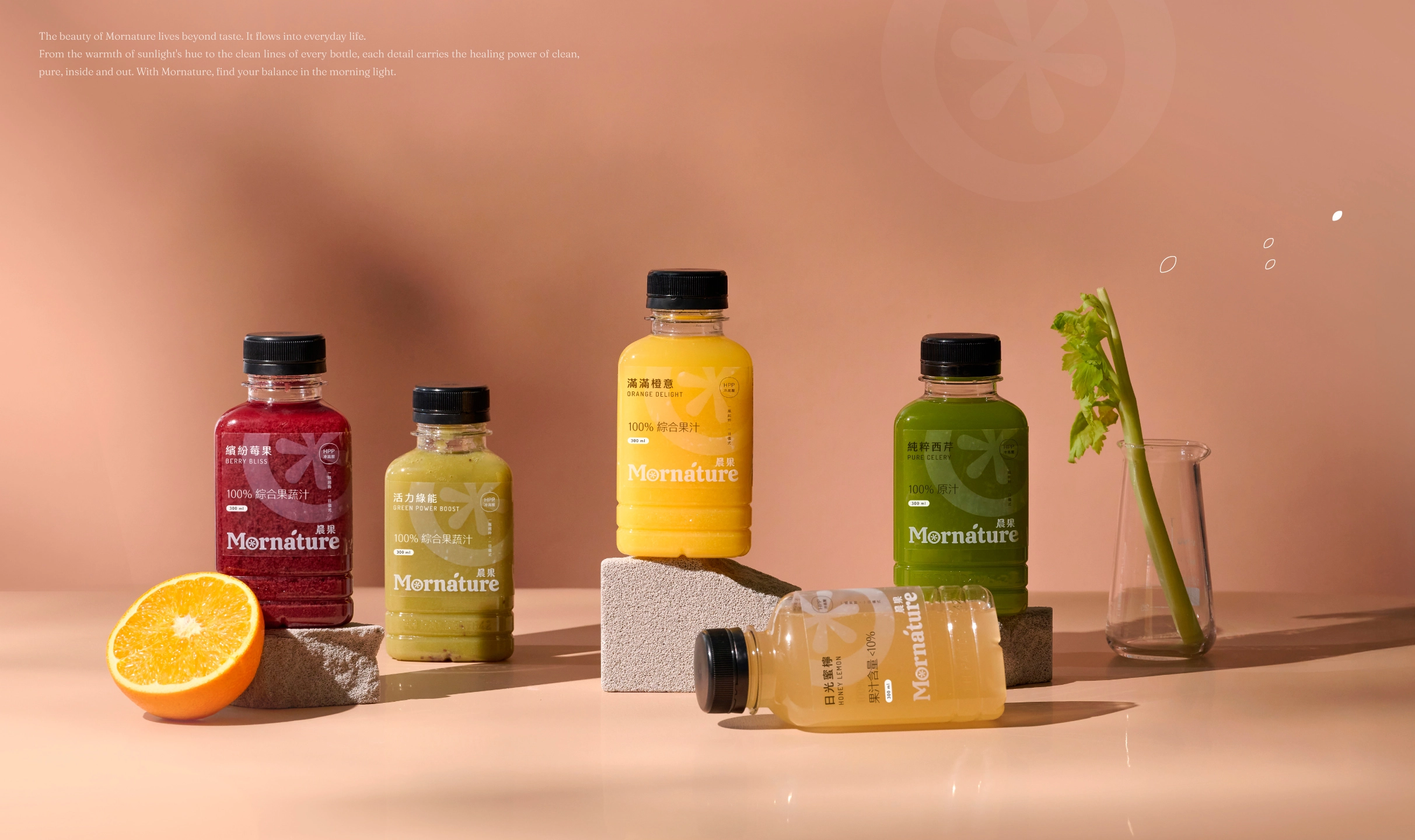 The visual strategy centers on "Natural Healing," using a Morandi palette to create a serene atmosphere. The logo merges sunlight, dew, and leaf silhouettes into a minimalist yet organic identity. Featuring semi-transparent matte packaging, the design allows the juice's natural colors to shine through, evoking the ethereal texture of morning mist. From product to identity, Mornature integrates purity into modern life with grace and elegance.