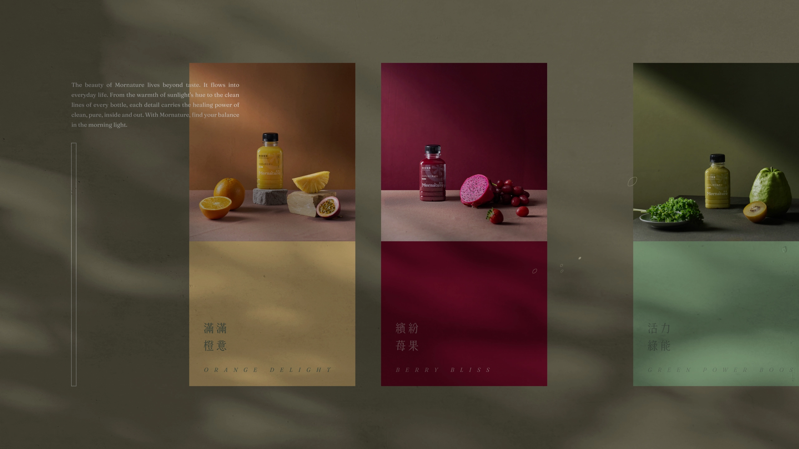 從產品開發到品牌視覺,晨果始終圍繞著「一瓶純粹,一日儀式」這個概念。透過轉化「晨」的感官經驗,讓自然與純淨以更優雅的姿態融入現代生活。