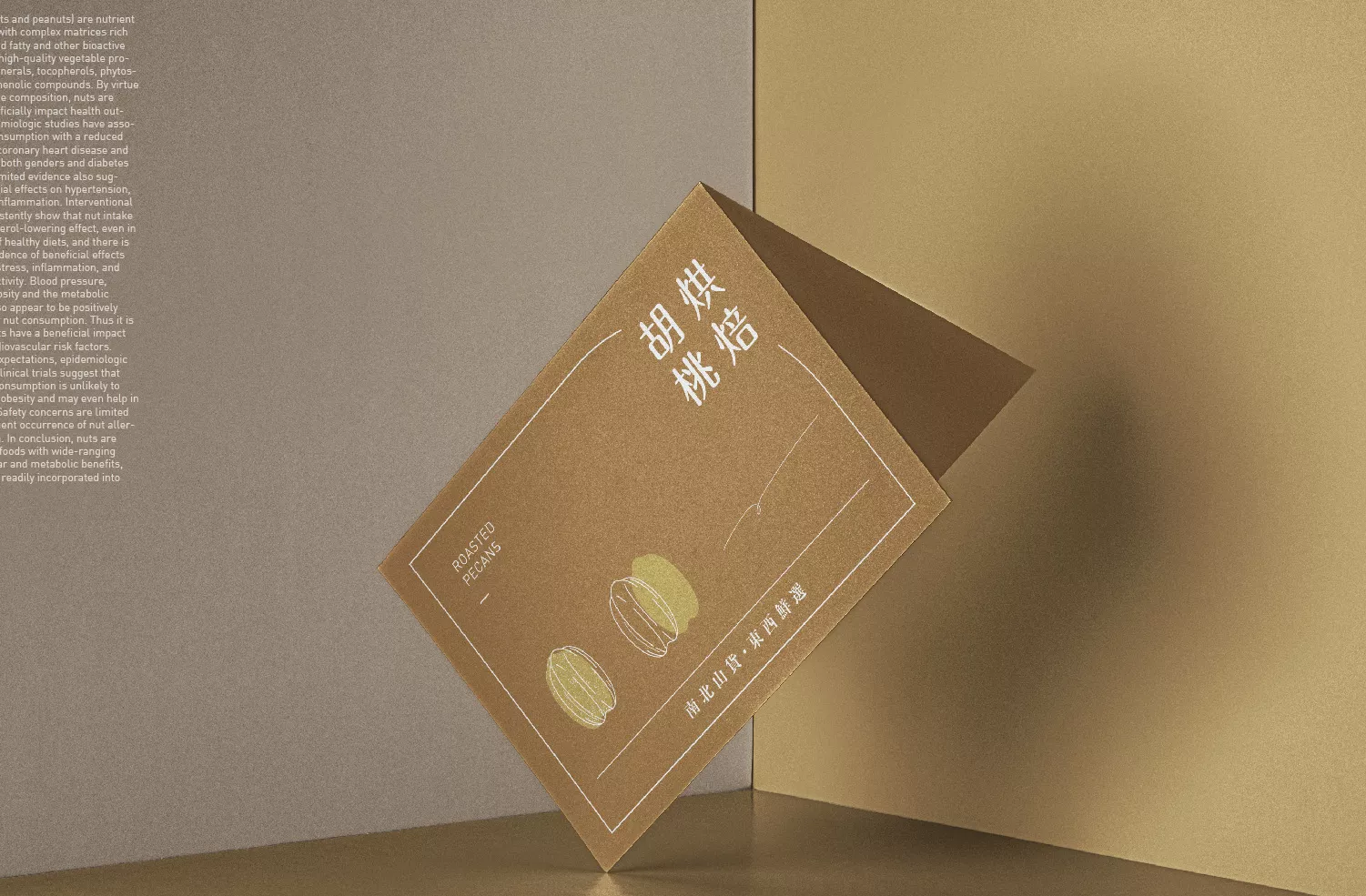 The packaging design for the nuts product line utilizes hand-drawn contour lines to the sketch the shape of the nuts in combination with hot foil stamping color blocks in order to highlight each product line’s unique characteristics. Furthermore, taking into consideration the various color changes of the roasting process into the color scheme, such as brown for the pecans, dark green for pumpkin seeds, and light yellow for macadamia nuts, the brand design emphasizes the details in the design and enhance the visual impression of the packaging.