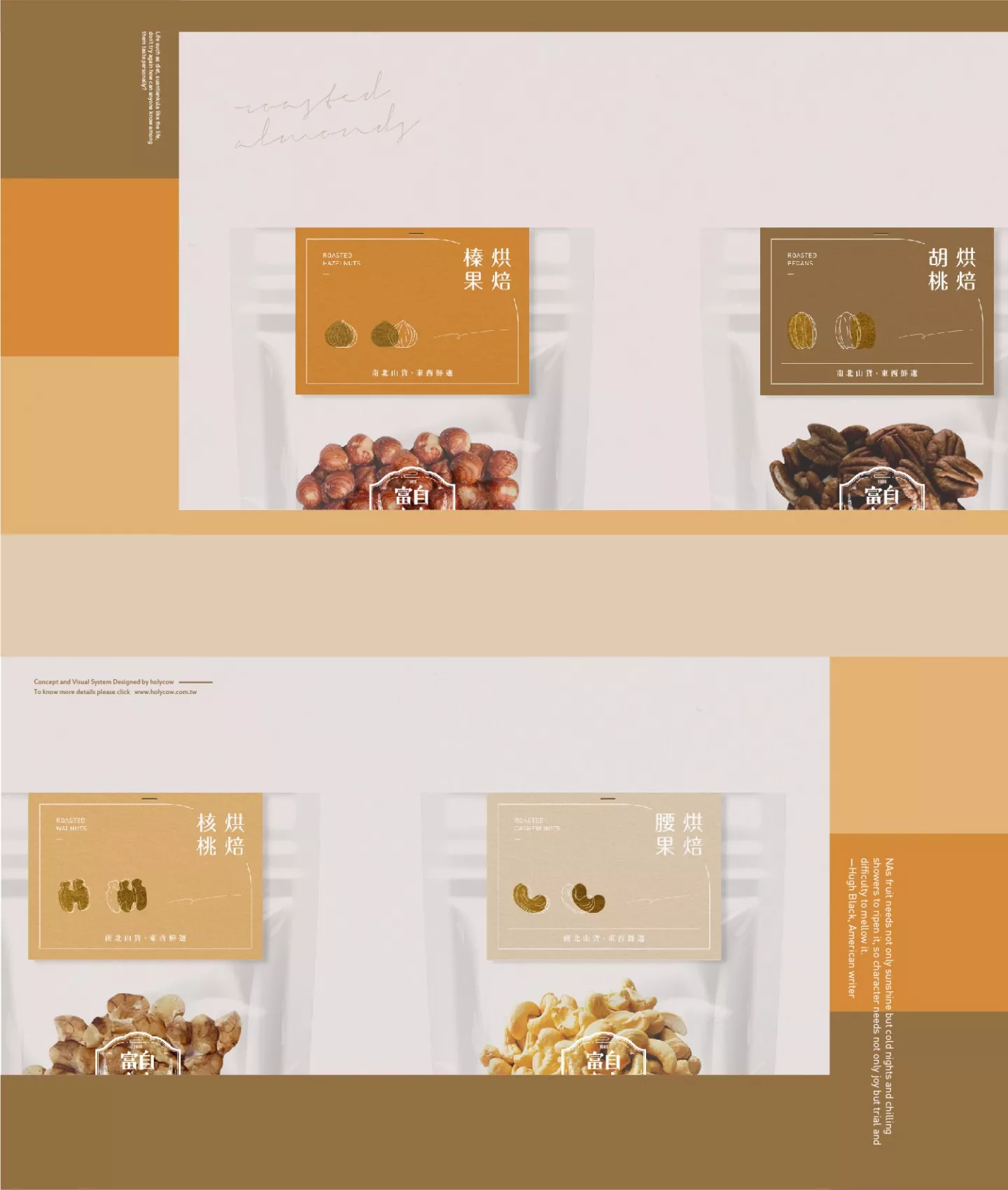 堅果包裝設計,以手繪線條勾勒堅果外型,融合燙金的色塊方式,凸顯每項堅果品種的略微不同,也在色彩規劃部分,帶出堅果烘焙過程中的顏色變化,如深咖啡的胡桃堅果、墨綠色的南瓜子、淡黃色的夏威夷豆等,使產品整體設計更加鮮明,提升包裝的視覺印象與感受。