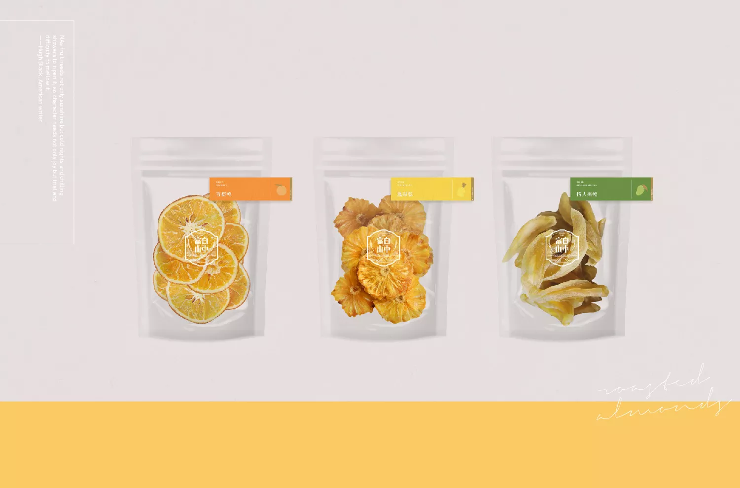 果乾包裝設計,選用白色霧面夾鏈式袋型,logo印白設計與包裝中間留空規劃,可從袋子外表看出食品本身,增加消費者的食用安心度。貼紙設計點綴整體包裝,以果乾口味區分品項,運用產品本身的原始色,如鳳梨乾、情人果乾等品項,使包裝色彩與貼紙相互對應,加深產品與包裝的連結性。